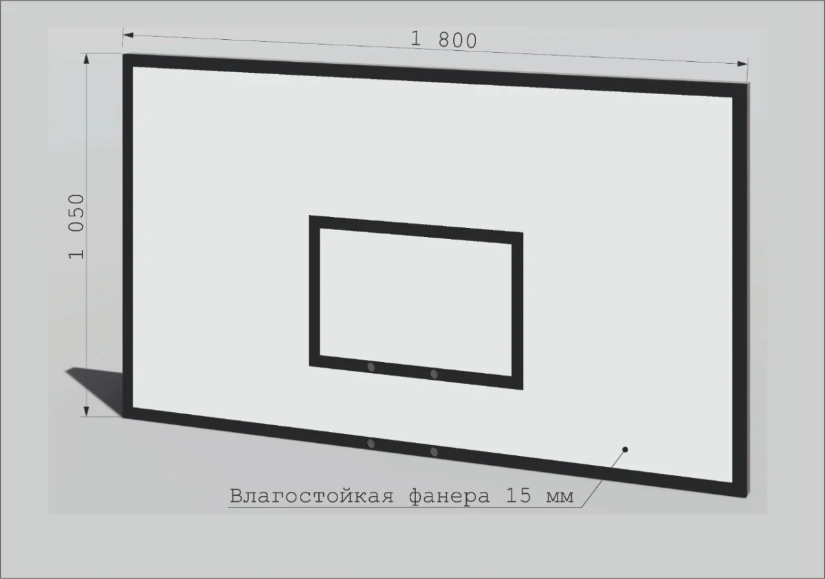 Влагостойкая фанера толщиной 15 мм, отверстия для крепления кольца баскетбольного: 100 мм (Ш) * 110 мм (В). Покраска – резиновая краска. Цвет разметки – черный.