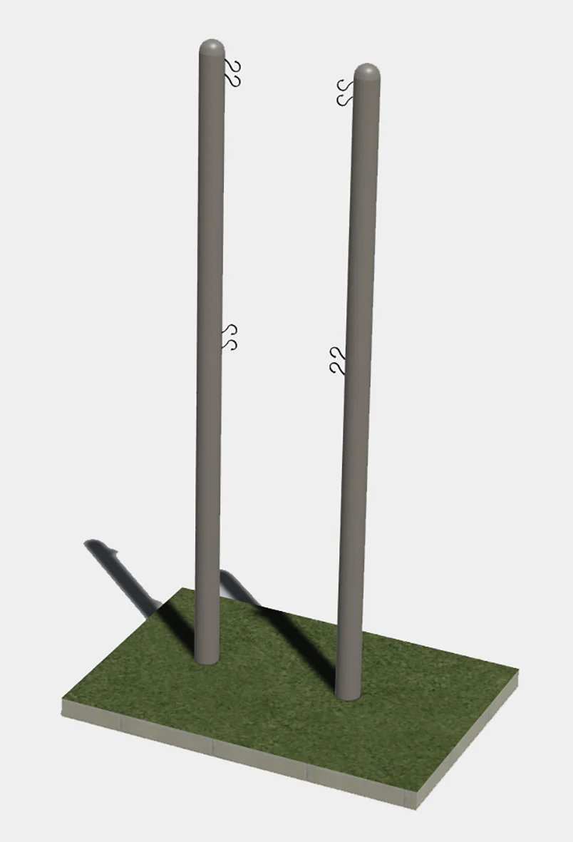 Опорные столбы в количестве 2 единиц высотой 2600мм от поверхности основания с крючками для крепления сетки.