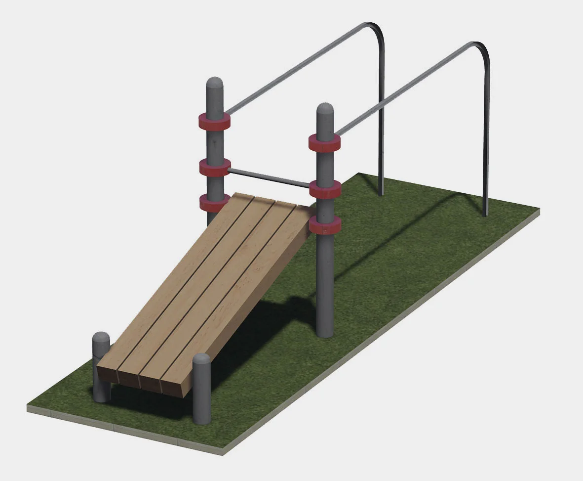 Рабочая поверхность брусьев составляет 1500 мм. Высота конструкции 1200 мм от уровня поверхности.