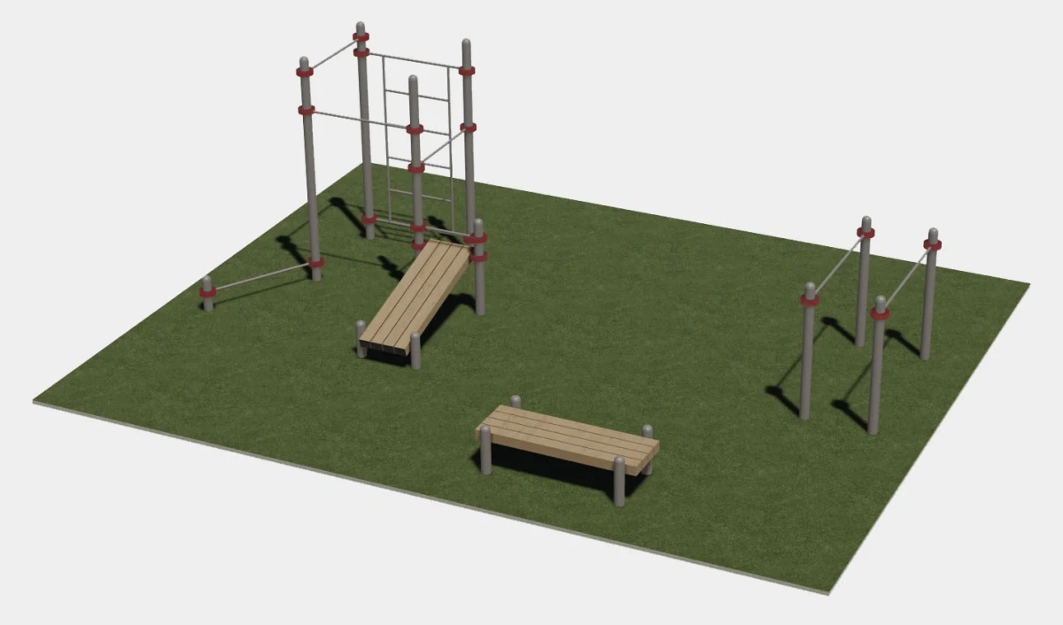 Комплектация: Спортивная площадка включает тренажеры: СК005, СК001 и Б001.