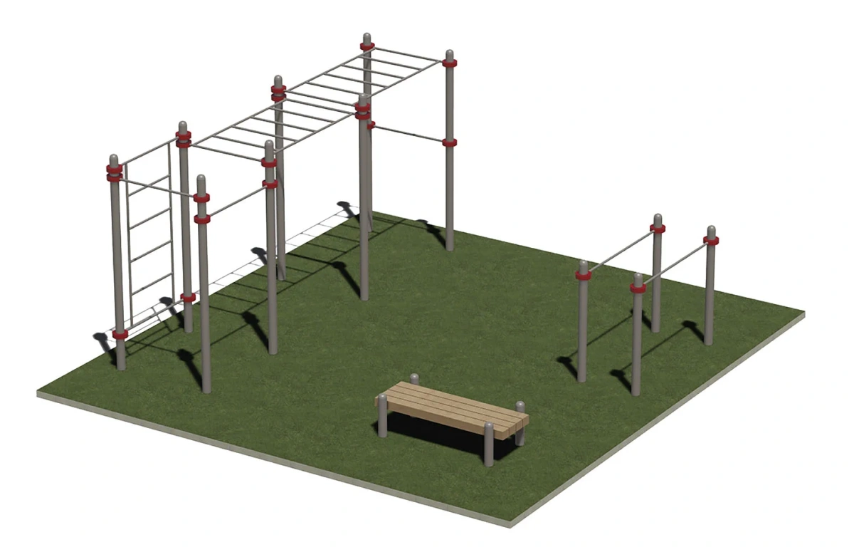 Спортивная площадка включает тренажеры: РК034, Б001 и СК001. Ориентировочный размер площадки 9,5 м * 9 м.