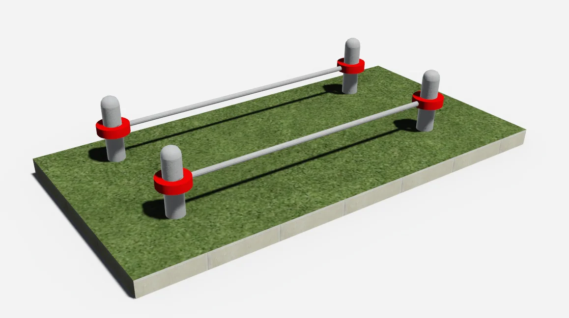 Опорные столбы высотой 300мм в количестве 4 единиц, диаметр которых предоставляется на выбор, 2 горизонтальные перекладины длиной 1700 мм, расположенные на высоте 200 мм от поверхности основания. Перекладина крепится к опорным столбам при помощи хомутов. Длина комплекса не более 2000 мм.