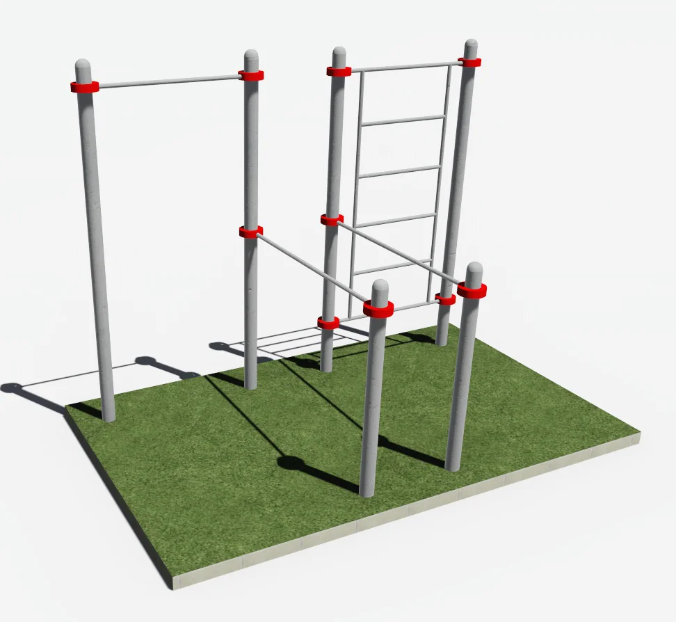 К опорным столбам высотой 2600 мм в количестве 4 единиц крепится на высоте 2450 мм шведская стенка и горизонтальная перекладина турника .