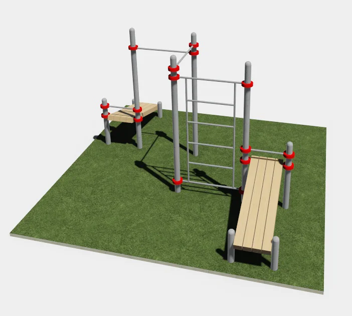 Данный комплекс включает в себя: две скамьи для пресса, шведскую стенку, два турника для подтягиваний. Шведская стенка крепится на высоте 2400 мм к опорным столбам высотой 2600 мм.