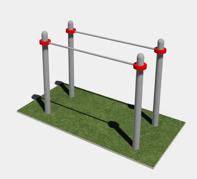 Опорные столбы высотой 1500 мм в количестве 4 единиц, диаметр которых предоставляется на выбор, 2 горизонтальные перекладины длиной 1700 мм, расположенная на высоте 1300 мм от поверхности основания. Перекладина крепится к опорным столбам при помощи хомутов. Длина комплекса не более 2000 мм.