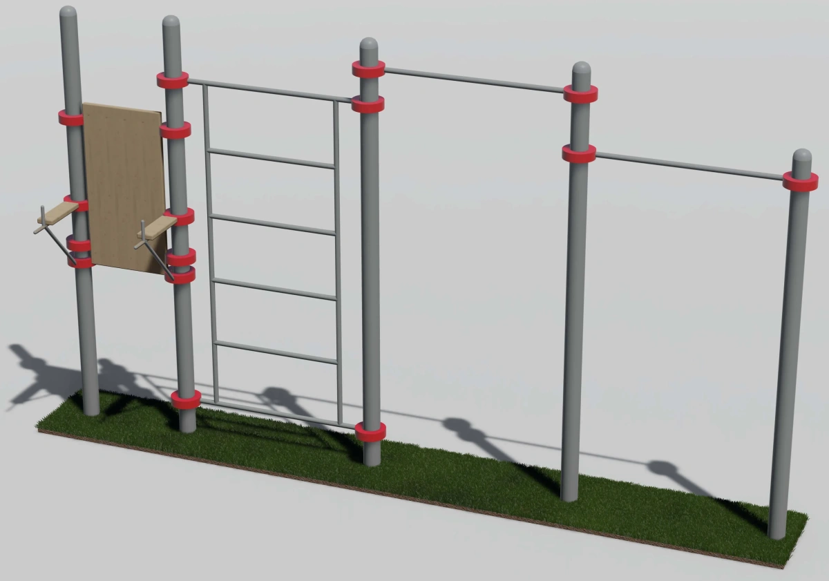 К опорным столбам высотой 2600 мм, 2300мм крепится с помощью хомутов на высоте от уровня основания: 2550 мм, 2200 мм – перекладина турника шириной 1200 мм, шведская стенка фиксируется на высоте 2450 мм. Ширина шведской стенки 1200 мм. Шаг составляет – 34 см. Доска и подлокотники для элемента комплекса «Вертикальный пресс» фиксируются так же при помощи хомутов на удобную высота для выполнения упражнений на пресс. Доска выполнена из материала – лиственница.