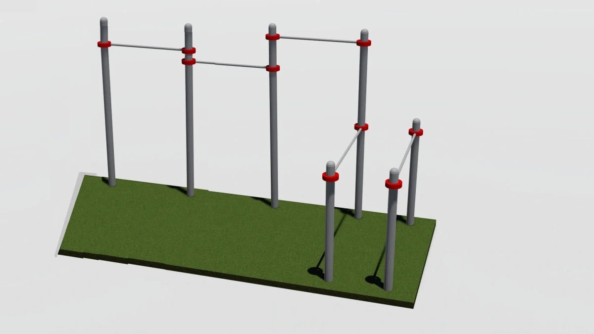 К опорным столбам высотой 2600мм, крепится с помощью хомутов перекладины турников шириной 1200 мм . Три столба высотой 1500 мм от уровня основания составляют опору для фиксации горизонтальных перекладин брусьев. Брусья фиксируются на высоте 1400 мм от уровня основания. Все составляющие комплекса крепятся между собой при помощи хомутов.